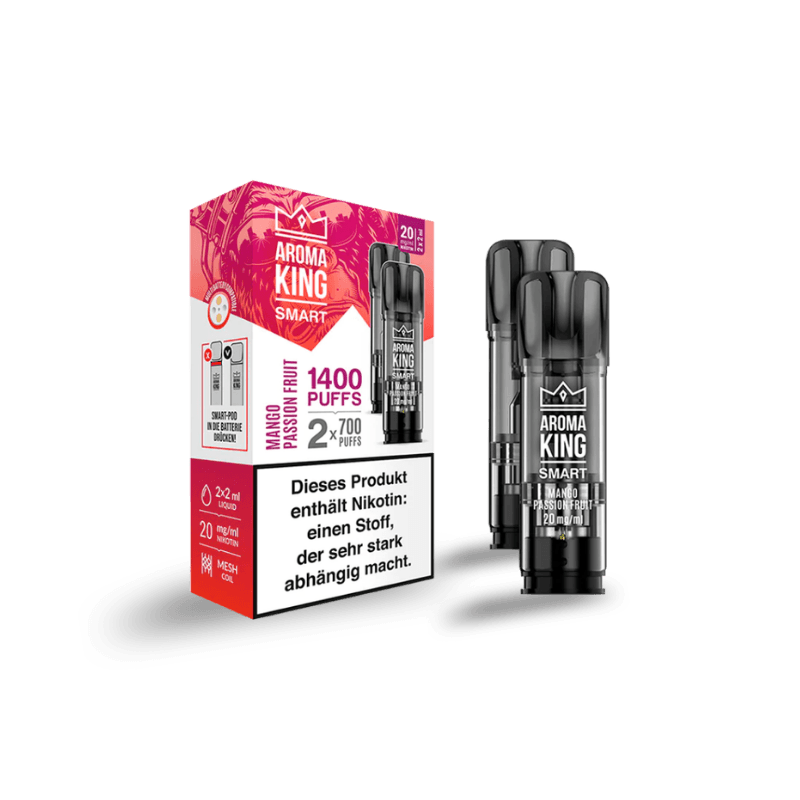 Jeder Pod enthält 2 ml Liquid, bietet bis zu 700 Züge und ist mit 20 mg/ml Nikotinsalz ausgestattet. Die Pods sind sofort einsatzbereit, auslaufsicher und kompatibel mit dem Aroma King Smart System sowie dem Elfbar Elfa Pod-System.
